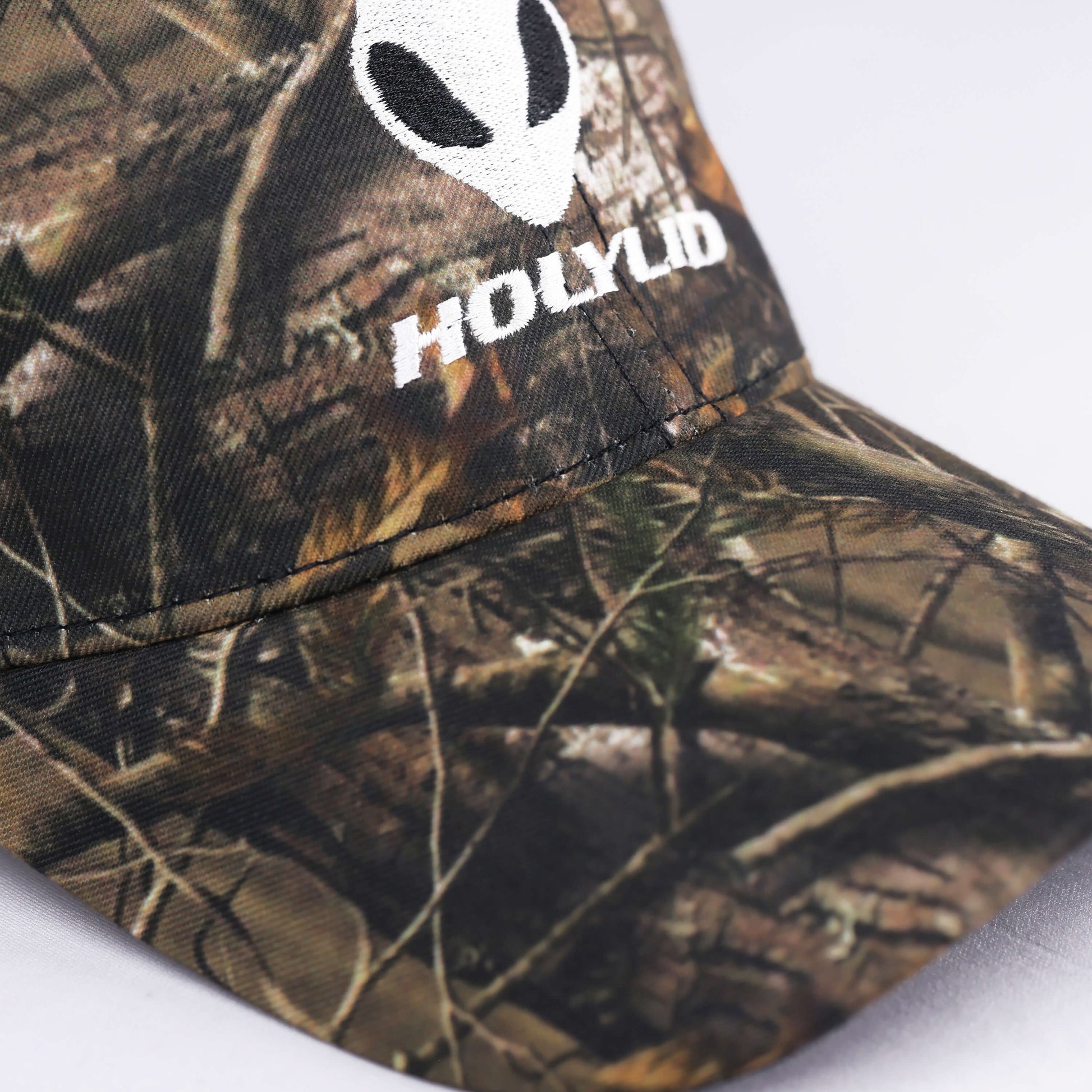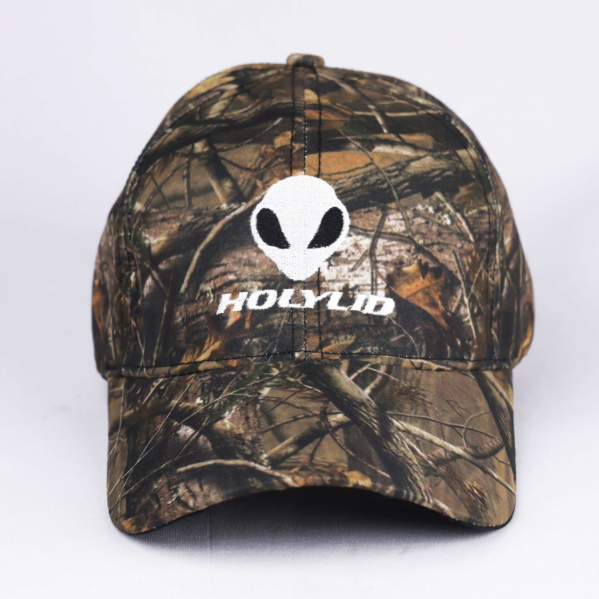 Iconic alien head and HOLYLID logo embroidered in white, set against a hyper-detailed forest camo texture—channeling survival instinct with cosmic identity.